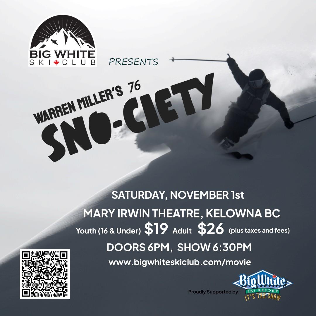 The Big White Ski Club presents Warren's Miller's 76th annual feature film. “SNO-CIETY” is not just about snow—it’s the tight-knit community, shared rituals, and sense of belonging that come with snow culture. The film explores how snow creates its own society, bound by mountain life, adventure, and seasonal tradition.
